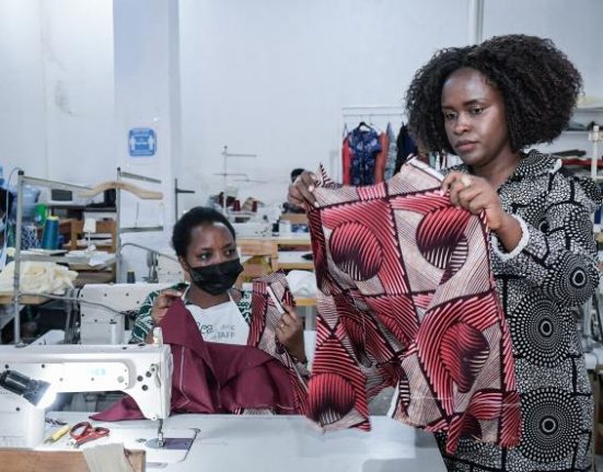 La créatrice Joselyne Umutoniwase, fondatrice de la marque Rwanda Clothing, dans son atelier de production à Kigali, en octobre 2021. SIMON MAINA / AFP